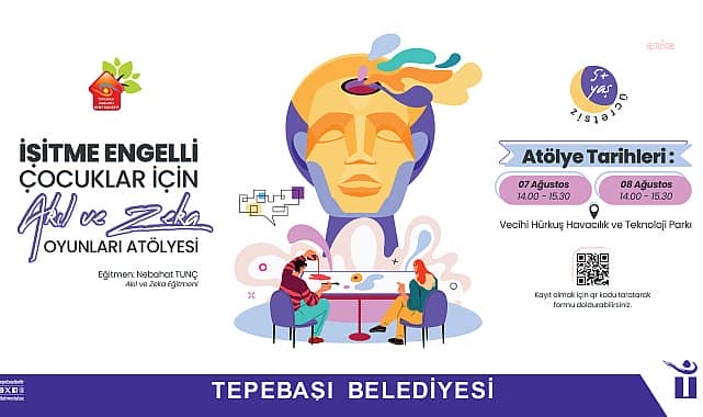 Tepebaşı Belediyesi ve Tepebaşı Sağlıklı Kent Konseyi tarafından 5 yaş üzeri işitme engelli çocuklar için ücretsiz olarak akıl ve zeka oyunları atölyesi düzenlenecek.Tepebaşı Belediyesi, 5 yaş üzeri işitme engelli çocuklar için Tepebaşı Sağlıklı Kent Konseyi işbirliğiyle akıl ve zeka oyunları atölyesini yaşama geçiriyor. Vecihi Hürkuş Havacılık ve Teknoloji Parkı’nda yürütülecek atölye, 7 Ağustos Pazartesi ve 8 Ağustos Salı günleri 14.00-15.30 saatleri arasında düzenlenecek.Akıl ve Zeka Eğitmeni Nebahat Tunç tarafından gerçekleştirilecek atölyeye kayıt işlemleri, duyuru görselinde yer alan qr kod üzerinden ya da http://tinyurl.com/akilze bağlantısından yapılabilecek.