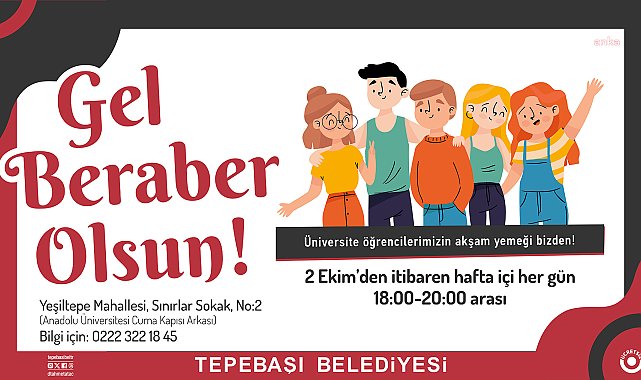 Tepebaşı Belediyesi’nin üniversite öğrencileri için hizmete sunduğu ücretsiz yemek hizmeti, yüz yüze eğitimin başlamasıyla birlikte 2 Ekim Pazartesi günü yeniden öğrenciler ile buluşuyor.Tepebaşı Belediyesi’nin, kentteki üniversite öğrencileri için “Gel beraber olsun” sloganı ile hafta içi her gün Anadolu Üniversitesi Cuma Kapısı arkasında bulunan Yeşiltepe Mahallesi Sınırlar Sokak No: 2 adresinde, üniversite öğrencilerine yönelik ücretsiz akşam yemeği hizmeti, 2 Ekim Pazartesi günü yeniden başlıyor. Üniversite öğrencileri, öğrenci belgesini ibraz ederek, yemek ikramından faydalanabiliyor.Nihal-İsmail Akçura Aşevi’nde pişirilen yemekler, akşam 18.00-20.00 saatleri arasında servis edilecek. Öte yandan, 19 Mayıs Gençlik Merkezi önünde, sabah okula giden üniversite öğrencileri için ücretsiz çorba ikramı da yine 2 Ekim Pazartesi günü başlayacak. Çorba ikramı ise 08.30-10.30 saatleri arasında yapılacak.