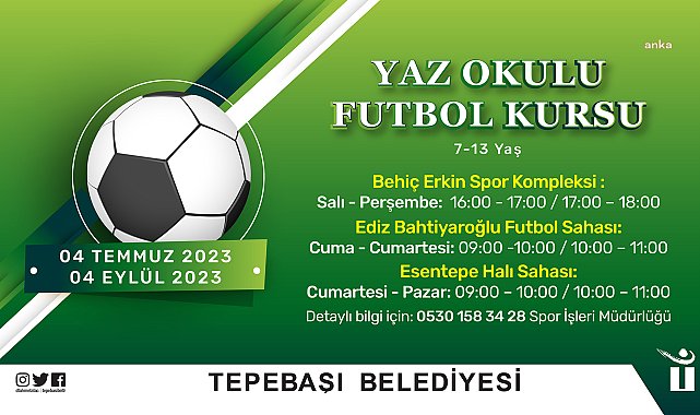 Tepebaşı Belediyesi’nin 7-13 yaş arası çocuklar için ücretsiz olarak düzenlediği Futbol Yaz Okulu’na kayıtlar başladı.Tepebaşı Belediyesi, çocukların yaz mevsimini verimli ve sağlıklı biçimde geçirmesi için etkinlikler düzenlemeyi sürdürüyor. Bu kapsamda yaşama geçirilen Futbol Yaz Okulu için kayıtlar başladı. Futbol Yaz Okulu, 4 Temmuz’da başlayıp 4 Eylül’e kadar devam edecek.7-13 yaş arası çocukların ücretsiz olarak kayıt olabileceği Yaz Okulu programı, Behiç Erkin Spor Kompleksi, Esentepe Halı Sahası ve Ediz Bahtiyaroğlu Futbol Sahası’nda yürütülecek. Kayıtlar ise söz konusu merkezlerden yaptırılabilecek. Yaz Okulu hakkında ayrıntılı bilgi almak isteyenler, 0 (530) 158 34 28 numaralı telefondan yetkililere ulaşabilecek.