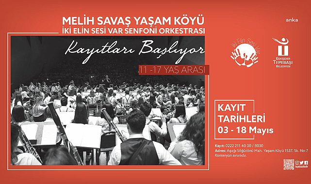 Tepebaşı Belediyesi’nin Melih Savaş Yaşam Köyü’nde çalışmalarına devam eden İki Elin Sesi Var Senfoni Orkestrası’na 11-17 yaş arası öğrenci kayıtları başlıyor.Tepebaşı Belediyesi İki Elin Sesi Var Senfoni Orkestrası, Melih Savaş Yaşam Köyü’ndeki çalışma merkezinde faaliyetlerini sürdürüyor. Yeni dönemde de çalışmalarına devam edecek orkestra için kayıtlar başlıyor. Kayıtlara, 11-17 yaş arası öğrenciler, 3-18 Mayıs 2023 tarihleri arasında başvurabilecek. Kontenjanın sınırlı olduğu kayıtlar için İki Elin Sesi Var Senfoni Orkestrası’nın Aşağı Söğütönü Mahallesi, Yaşam Köyü 1537. Sokak No: 7 adresinden veya 0 (222) 211 4000 / 8030 numaralı telefondan yetkililere ulaşabilecek.