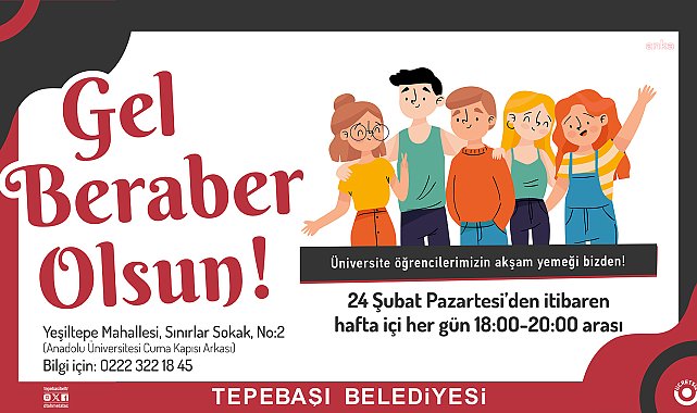 (ESKİŞEHİR) - Tepebaşı Belediyesi’nin üniversite öğrencileri için hayata geçirdiği ücretsiz yemek hizmeti, sömestir tatili dolayısıyla verilen aranın ardından 24 Şubat itibarıyla devam edecek.Tepebaşı Belediyesi’nin ilçedeki üniversite öğrencileri için “Gel beraber olsun” sloganı ile başlattığı yemek hizmeti yoğun ilgiyle devam ediyor. Öğrencilere, hafta içi her akşam Anadolu Üniversitesi Cuma kapısı arkasında bulunan Yeşiltepe Mahallesi Sınırlar Sokak No: 2 adresinde akşam yemeği ücretsiz olarak sunuluyor.Nihal-İsmail Akçura Aşevi’nde uzman belediye personeli tarafından özenle pişirilen yemekler, 18.00-20.00 saatleri arasında ikram ediliyor. Üniversite öğrencileri, öğrenci belgesi ibraz ederek, yemek ikramından faydalanabiliyor.Belediye yetkilileri, sömestir tatili dolayısıyla verilen molanın ardından ücretsiz yemek hizmetine 24 Şubat Pazartesi günü itibari ile devam edileceğini duyurdu.