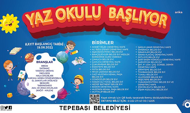 Tepebaşı Belediyesi bünyesinde bulunan Belde Evleri ile Deneyimli Kafeler ve Çocuk Sanat ve Kütür Merkezleri’nde düzenlenecek yaz okulu için kayıtlar yarın başlıyor.Tepebaşı’nın 33 farklı noktasında bulunan Belde Evi ve Deneyimli Kafeler’de düzenlenecek yaz okulu için kayıtlar 19 Haziran Pazartesi günü (yarın) başlıyor. Çocukların yaz tatilini verimli ve eğlenceli geçirebilmeleri için düzenlenecek yaz okulunda resim, satranç, yaratıcı drama, İngilizce, halk oyunları, Kur’an-ı Kerim, el sanatları atölyesi, seramik, tekvando, akıl ve zeka oyunları gibi branşlarda eğitim verilecek. 23 Nisan, Çukurhisar, Esentepe, Türkan Saylan Çocuk Sanat ve Kültür Merkezleri ile Özdilek Sanat Merkezi ve 29 Ekim Gençlik Merkezi’nde de farklı branşlarda yaz kursları açılıyor. 3 Temmuz’da başlayacak jimnastik, çocuk zumba, sihirli deneyler, müzikli masallar atölyesi, bilardo, cam füzyon, eğlenceli Japonya gibi birçok branşta açılacak kurslar için de kayıtlar ise yarın başlayacak ve 21 Haziran'a dek sürecek. Ücretsiz olarak düzenlenecek yaz okuluna kayıt yaptırmak isteyenler, duyuruda yer alan karekodu okutarak kayıt formunu doldurabilecek ya da https://www.tepebasi.bel.tr/etkinlikler adresinden de kayıt bağlantısına ulaşılabilecek.Yaz okulu hakkında ayrıntılı bilgi almak isteyenler, 0 (222) 211 40 00/4205 numaralı telefondan, Çocuk Sanat ve Kültür Merkezleri’ndeki kurslar için de 0 (222) 322 18 45 numaralı telefondan yetkililere ulaşabilecek.