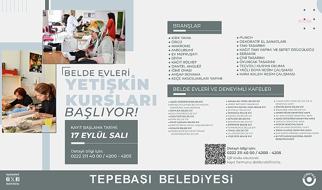 (ESKİŞEHİR)- Tepebaşı Belediyesi'nin 'Belde Evleri Yetişkin Kursları' kayıtları başlıyor. 21 farklı branşta düzenlenen kurslar hem kırsalda hem de merkezde olmak üzere 35 noktada vatandaşlar ile buluşacak.Tepebaşı Belediyesi, çocuklar ve gençlerin yanı sıra yetişkin vatandaşlar için kurs programları düzenlemeye devam ediyor. 21 farklı branştaki kurs, kentin merkez ve kırsal mahallelerinde bulunan 25 Belde Evi ve 10 Deneyimli Kafe olmak üzere 35 noktada vatandaşlar ile buluşacak. Kurs programları için kayıt işlemleri 17 Eylül Salı günü alınmaya başlayacak. Açılacak kurslar arasında kırk yama, makrome, örgü, amigurumi, ev mefruşatı, giyim, kağıt rölyef, dantel anglez, iğne oyası, ahşap boyama, keçe aksesuarları yapımı, punch, dekoratif el sanatları, takı tasarımı, kağıt yapımı ve sepet örgücülüğü, seramik, çini tasarımı, oyuncak tasarımı, tecvidli Kur’an okuma, yağlı boya resim çalışması ve kara kalem resim çalışması branşları yer alıyor