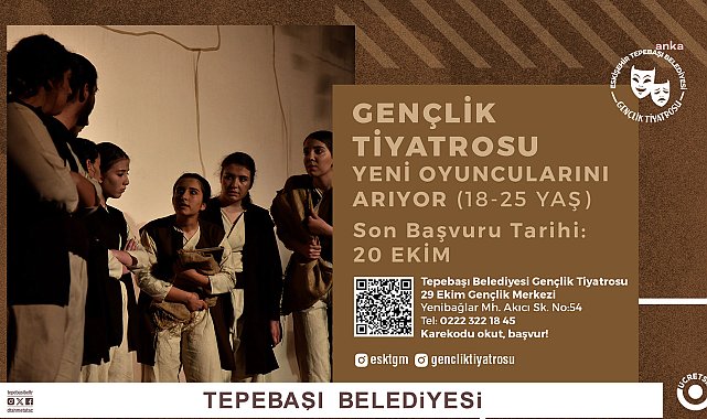 (ESKİŞEHİR) - Tepebaşı Belediyesi Gençlik Tiyatrosu, yeni dönem için öğrencilerini arıyor. Tiyatro oyuncusu olmak isteyenler, 20 Ekim Pazar gününe kadar Gençlik Tiyatrosu'na katılmak için başvuruda bulunabilecek. Tepebaşı Belediyesi Gençlik Tiyatrosu, sahnelediği oyunlar ile başarılı çalışmalara imza atarken yeni öğrencilerini de arıyor. 18-25 yaş arasında tiyatro eğitimi almak ve Gençlik Tiyatrosu’nun üyesi olmak isteyen gençler, duyuru görselinde yer alan QR kodu okutarak veya ‘https://tinyurl.com/gencliktiyatrosu’ bağlantısına tıklayarak kayıt formuna ulaşabilecek.Tiyatroya ilgi duyan ve bu alanda kendisini geliştirmek isteyen gençler, Gençlik Tiyatrosu’na 0 (222) 322 18 45 numaralı telefondan ve Yeni Bağlar Mahallesi Akıcı Sokak No: 54 adresinde bulunan 29 Ekim Gençlik Merkezi’nden ulaşabilecek.Belediye yetkilileri, başvuru için son günün 20 Ekim Pazar günü olduğunu duyurdu.