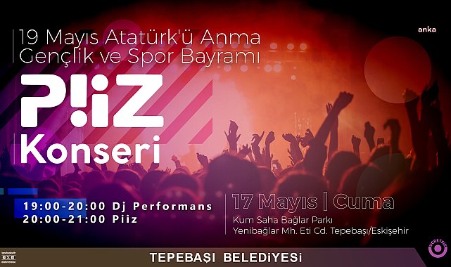 (ESKİŞEHİR) - Tepebaşı Belediyesi’nin 19 Mayıs Atatürk’ü Anma Gençlik ve Spor Bayramı dolayısıyla düzenlediği konserde sevilen müzik grubu Piiz, Eskişehirlilere bayram coşkusunu yaşatacak.Tepebaşı’nda 19 Mayıs Atatürk’ü Anma Gençlik ve Spor Bayramı kutlamaları kapsamında 17 Mayıs Cuma günü sevilen müzik grubu Piiz sahne alacak. Yenibağlar Mahallesi Eti Caddesi’ndeki Kum Saha Bağlar Parkı’nda gerçekleşecek konser öncesinde DJ performansı olacak. DJ performansı saat 19.00’da başlayacak, ardından sahneye çıkacak Piiz, şarkılarını Eskişehirliler için söyleyecek.