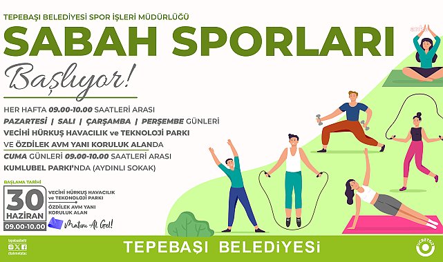 (ESKİŞEHİR) - Tepebaşı Belediyesi tarafından düzenlenen egzersiz eğitimleri, Eskişehirlileri açık havada sporla buluşturmaya bu yıl da devam edecek.Tepebaşı Belediyesi, vatandaşların katılımı ile açık havada düzenlediği etkinliklerde Eskişehirlileri spor ile buluşturmaya devam ediyor. Spor İşleri Müdürlüğü tarafından açık havada düzenlenecek sabah sporu etkinlikleri, 3 farklı noktada yapılacak. Her hafta saat 09.00-10.00 saatleri arasında yapılacak olan etkinlikler 30 Haziran Pazartesi günü itibariyle başlıyor.Sabah sporları Pazartesi-Salı-Çarşamba ve Perşembe günleri Vecihi Hürkuş Havacılık ve Teknoloji Parkı ile Özdilek AVM yanı koruluk alanda; Cuma günleri ise Kumlubel Parkı’nda (Aydınlı Sokak) yapılacak.Uzman spor eğitmenleri eşliğinde yapılacak etkinliklerde Eskişehirliler, açık havada spor yapmanın keyfini yaşayacak.