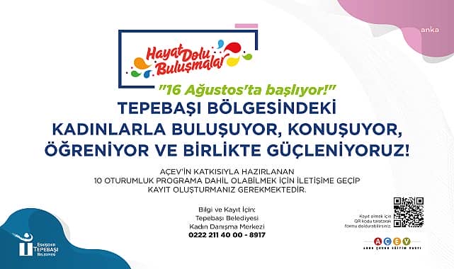 Tepebaşı Belediyesi ve Anne Çocuk Eğitim Vakfı (AÇEV) iş birliğinde gerçekleştirilecek ‘Hayat Dolu Buluşmalar’, 16 Ağustos’ta başlıyor.Tepebaşı Belediyesi, kentte yaşayan kadınlara yönelik etkinlikler düzenlemeye devam ediyor. AÇEV iş birliği ile gerçekleştirilecek Hayat Dolu Buluşmalar etkinliği de 16 Ağustos 2023 tarihinde başlayacak. “Tepebaşı bölgesindeki kadınlarla buluşuyor, konuşuyor, öğreniyor ve birlikte güçleniyoruz” sloganı ile düzenlenecek etkinlikler, AÇEV’in katkıları ile 10 oturumdan oluşacak. Programın ana başlıkları arasında şiddete karşı haklarımız, sağlığımız, sağlıklı iletişim, evde eşit iş bölümü, tüm çocukları koruyalım gibi konular yer alıyor.Kadınların programa dahil olmak için, duyuru görselinde yer alan QR kodu taratarak ya da https://tinyurl.com/hdolu linki üzerinden etkinliğe kayıt olmaları gerekecek. Etkinlik hakkında bilgi almak isteyen kadınlar, 0 (222) 211 40 00-8917 numaralı telefondan Tepebaşı Belediyesi Kadın Danışma Merkezi’ne ulaşabilecek.