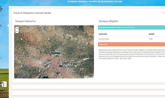 Kurulan Tarımsal Tahmin ve Erken Uyarı İstasyonları ile ilgili detaylı bilgi almak isteyenler, 0 (222) 211 40 00/8919 numaralı telefondan yetkililere ulaşabilecek. Tüm bilgilerin yer aldığı ‘http://ziraitahmin.tepebasi.bel.tr’ adresi de ziyaret edebilecek.