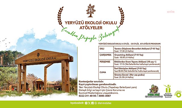 Tepebaşı Belediyesi ile Sakin Okul Eğitim Kültür ve Sanat Derneği iş birliğinde hayata geçirilen Yeryüzü Ekoloji Okulu’nda ücretsiz olarak gerçekleştirilen atölye çalışmaları kapsamında Eylül ayı programı başlıyor.Tepebaşı Belediyesi’nin, Sakin Okul Eğitim Kültür ve Sanat Derneği ile birlikte hayata geçirdiği Yeryüzü Ekoloji Okulu Projesi, kentte yaşayanlar ve özellikle çocuklar için deney, gözlem ve eğitim alanları sunmayı sürdürüyor.Tepebaşı Belediyesi Hizmet Binası yanında hazırlanan alanda faaliyetlerini gerçekleştiren Yeryüzü Ekoloji Okulu, doğayla ilişki kurmayı, doğaya erişimi, bir arada yaşama kültürünü, sürdürebilirliği, yerel ekosistemle oynamayı, toplumsal aktivizmi, mekanı tanımayı ve mekan bilincini ön plana çıkarmayı amaçlıyor.Yeryüzü Ekoloji Okulu’nda 4 Eylül’de başlayacak atölye çalışmaları arasında; Yaratıcı düşünme becerileri atölyesi (7-10 yaş), Oryantring atölyesi (7-10 yaş), Bitkilerden krem yapımı atölyesi (18 yaş üstü) İleri dönüşüm atölyesi (7-10 yaş) ve sinema gecesi (Her yaş grubu) bulunuyor.Tepebaşı Belediyesi yetkilileri, kontenjanların sınırlı olduğu atölyeler hakkında bilgi almak isteyenlerin, Çevre Koruma ve Kontrol Müdürlüğü’ne 0 (222) 211 40 00 / 3085-3087 numaralı telefondan ulaşılabileceğini bildirdi.