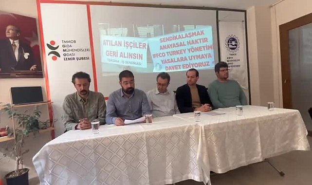 TMMOB Gıda Mühendisleri Odası İzmir Şubesi ve TMMOB Kimya Mühendisleri Odası Ege Bölge Şubesi tarafından yapılan ortak açıklamada, Iffco Turkey Gıda Sanayi ve Ticaret A.Ş’nin 3 gıda mühendisi, 1 kimya mühendisi ile 1 işçiyi sendikal faaliyetlerinden dolayı iş hukukuna aykırı bir şekilde işten attığı belirtilerek, tepki gösterildi. Açıklamada, "Iffco Turkey firmasına sesleniyoruz; sendikal faaliyetler bahane edilerek çalışanları işten atmak suçtur. Bir an önce bu suçu işlemekten vazgeçin ve işten atılan çalışanları işlerine iade edin. Onlar için sağlıklı bir çalışma ortamı ve insanca yaşayacak ücret taleplerini karşılayın.” ifadeleri yer aldı.TMMOB Gıda Mühendisleri Odası İzmir Şubesi ve TMMOB Kimya Mühendisleri Odası Ege Bölge Şubesi tarafından, Iffco Turkey Gıda Sanayi ve Ticaret A.Ş’nin 3 gıda mühendisi, 1 kimya mühendisi ile 1 işçiyi sendikal faaliyetlerinden dolayı iş hukukuna aykırı bir şekilde işten attığı vurgulanarak, ortak açıklama yapıldı. TMMOB Gıda Mühendisleri Odası İzmir Şubesi Yönetim Kurulu Başkanı Ömer Ulaş Kırım ve TMMOB Kimya Mühendisleri Odası Ege Bölge Şubesi Yönetim Kurulu 2. Başkanı Cem Aynalı'nın yaptığı açıklama sırasında, TMMOB İzmir İl Koordinasyon Kurulu Sekreteri Aykut Akdemir ile işten atılan Gıda Mühendisi Ömer Bulut Yıldırım ve Kimya Mühendisi Mutlu Boran da bulundu."İLETİŞİM KURMAYA ÇALIŞTIK, SALDIRGAN ÜSLUP SERGİLEDİLER"Ortak açıklamada şunlar kaydedildi:"Neoliberal kapitalist sistem, ücretli çalışanların iş güvencesini tamamen ortadan kaldırarak keyfi işten çıkarmaları sıradan uygulamalar haline getirmiştir. Son olarak İzmir Atatürk Organize Sanayi Bölgesi'nde bulunan Iffco Turkey Gıda San. ve Tic. A.Ş’de uğradıkları mobbinge, fazla mesai sürelerine ve düşük ücretlerine karşı iş yerinde örgütlenen Tek Gıda İş Sendikasına üye olan, aynı zamanda odalarımızın da üyesi olan 3 gıda mühendisi ve 1 kimya mühendisi meslektaşımız ile 1 işçi arkadaşımız sendikal faaliyetlerinden dolayı iş hukukuna aykırı bir şekilde 29 Şubat 2024 tarihinde işten atılmışlardır.Bizler TMMOB’ye bağlı odalar olarak üyelerimizin 'mesleki etkinliklerini kullanmaları dolayısıyla karşılaşacakları her çeşit haksızlık, şeref ve onurlarını kırıcı davranışlara karşı bütün girişimleri yapmak, mesleki dayanışmayı kurmak ve güçlendirmek' ilkemize dayanarak ilgili firma ile iletişim kurmaya çalıştık. Maalesef iyi niyetli bu girişimimize olumsuz yanıt vererek sadece telefonda, kararın firma yönetiminin kararı olduğunu belirtmişlerdir. Üyelerimizin haklarını savunacağımızı belirttiğimizde ise saldırgan bir üslup sergileyerek bu işe karışmamamız gerektiğini telkin etmişlerdir. İşe geri dönmek için fabrika önünde oturma eylemi başlatan üyelerimizin ve mesai arkadaşlarının sonuna kadar yanlarında olduğumuzun bilinmesini istiyoruz. Üyelerimizin işe iadeleri ve işyeri ortamının sağlıklı koşullarının sağlanması için mücadelelerine destek olacağız."Enflasyonist politikaların ülkede ücretli çalışanları hızla alt gelir düzeyine çektiği belirtilen açıklamada, "Artık çalışma yaşamında beyaz yaka mavi yaka ayırımı tamamen yapay hale gelmiş olup, ekonomik olarak da çalışma şartlarında da aynı sıkıntılarla karşı karşıya kalmaktadırlar. Buna karşı durabilmenin bir yolu iş yerindeki sendikada örgütlenerek birlikte mücadele etmektir. Sendika üyesi olmak Anayasa'nın 51. maddesine göre her çalışanın hakkıdır ve işletme yönetimleri ve yönetim temsilcileri bu hakka uymakla mükelleftir. Anayasal hakka uyulması kurumların/kişilerin inisiyatifinde değildir." denildi.“İŞÇİ ARKADAŞLARIMIZA HER TÜRLÜ DESTEĞİ VERECEĞİZ”Açıklamada, şunlar kaydedildi:"Bu yolu açan Iffco Turkey’deki mühendis ve işçi arkadaşlarımızın direnişinin başarıya ulaşması için her türlü desteği verecek ve kamuoyunu Iffco Turkey’in bu hukuk dışı icraatı hakkında bilgilendirmek ve harekete geçirmek için tüm iletişim kanallarımızı kullanacağız. Vardiya mühendisi olarak çalışmakta olan gıda mühendisi ve kimya mühendisi arkadaşlarımız işten çıkarılmışken, işletmede üretilen ürünlerin gıda güvenliğinin nasıl sağlanabileceği soru işaretidir. Firmanın aynı zamanda uluslararası kalite standardizasyon belgelerinin olduğu bilinmektedir. Aynı anda bu kadar çok teknik personelini işten çıkartan bir işletmenin kalite güvencesinin ve güvenilirliğinin de tehlikeye girdiğini düşünmekteyiz.Söz konusu firmanın belgeleri arasında yer alan uluslararası geçerli sosyal uygunluk belgesinin de olduğu bilinmektedir. Çalışanlarını mesnetsiz gerekçelerle işten çıkaran ve mobbing uygulayan bir firmanın, sosyal uygunluk belgesini bundan sonra nasıl sürdürülebilirliğini sağlayacağı merak konusudur. Odalarımızın bu konunun da takipçisi olacağını bildirmek isteriz. Halihazırda işletmede çalışmaya devam eden meslektaşlarımızla görüşülmüş, süreç ve yaşananlarla ilgili kendilerinin de fikir, görüş ve varsa şikâyetlerini iletmeleri istenmiştir. Kendileri konunun üst yönetim düzeyinde ilerletildiği ve daha fazla bilgilerinin olmadığını bildirmişlerdir. Arkadaşlarımızın işten çıkarılma bildirgelerinde bölüm sorumlusuna ihtiyaç kalmadığı ve görevlerinin üretim müdürü ve fabrika müdürü tarafından yürütüleceği belirtilmiştir. Ancak bu durum üretim müdürünün ve fabrika müdürünün 'Süreç bizim dışımızda işlemektedir' beyanlarıyla tezatlık göstermektedir. Meslektaşlarımızın mobbinge uğraması ve işten atılma süreçlerinde işletmedeki üst düzey mühendislerin etkisi olup olmadığı odalarımız tarafından araştırılmakta