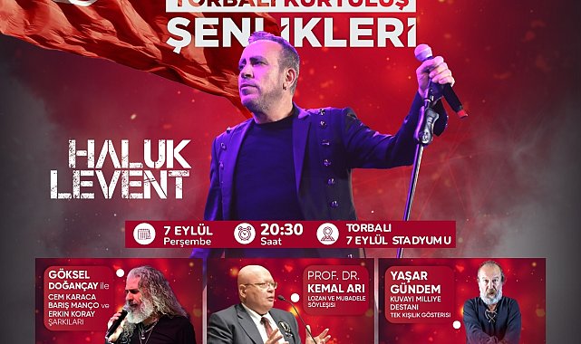 Torbalı’nın düşman işgalinden kurtuluşunun 101. yılı her sene olduğu gibi bu yıl da bir dizi etkinlikle kutlanacak. 3 gün sürecek kutlamaların son günü 7 Eylül’de Haluk Levent, sahne alacak.Torbalı’nın düşman işgalinden kurtuluşunun 101. yılı bu yıl da bir dizi etkinlikle kutlanacak. Torbalı Belediyesi'nin düzenleyeceği 7 Eylül Kurtuluş Şenlikleri'ne ilginin yoğun olması beklenirken, etkinlikler 5 Eylül Salı günü başlayacak.Gelenekselleşen 7 Eylül Kurtuluş Senlikleri için Torbalı Belediyesi tüm hazırlıklarını tamamladı.Kurtuluş Şenliklerinin ilk günü olan 5 Eylül Salı günü Cem Karaca'nın solisti ve rock müziğin güçlü sesi Göksel Doğançay sahne alacak. Cem Karaca, Barış Manço ve kısa bir süre önce hayatını kaybeden Türk Rock Müziğinin ölümsüz ismi Erkin Koray’ın şarkıları, Gazi Çamlığı Etkinlik Alanı’nda Doğançay’ın güçlü sesiyle yankılanacak.6 Eylül Çarşamba günü söyleşi ve tiyatro gösterisi Torbalılılarla buluşacak. Türkiye’nin yetiştirdiği önemli tarihçilerden olan Prof. Dr. Kemal Arı, saat 17.00’da ‘Lozan ve Mübadele’ başlıklı söyleşi ile İsmail Uygur Kültür Merkezi bahçesinde vatandaşlarla buluşacak. Akşam 20.30’da ise Gazi Çamlığı Etkinlik Alanı’nda, ünlü tiyatro sanatçısı Yaşar Gündem, 'Kuva-yı Milliye Destanı' isimli tek kişilik gösterisi ile sahnede olacak.Kurtuluş’un yıl dönümü olan 7 Eylül’de resmi tören ve bando konserleri ile başlayacak olan günün sonunda ise 7 Eylül İlçe Stadı’nda ünlü sanatçı Haluk Levent konser verecek.BAŞKAN TEKİN’DEN DAVETTüm İzmirlileri 3 gün sürecek Kurtuluş Şenliklerine davet eden Torbalı Belediye Başkanı Mithat Tekin, “Düşman işgalinden kurtuluşumuzun 101. yılı dolayısıyla her kesime hitap eden bir dizi etkinlik hazırladık. Torbalılılar istedi biz de getiriyoruz; Kurtuluş Şenliklerimizin son gününde Haluk Levent konseri gerçekleşecek. Konser ve etkinliklerimize tüm ilçe halkımızı olduğu gibi İzmirli hemşerilerimizi de bekliyoruz” dedi.