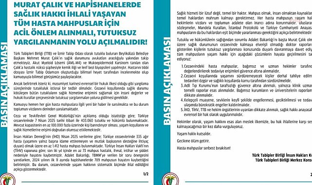 (ANKARA) - Türk Tabipleri Birliği'nden (TTB) yapılan açıklamada, "Tutuklu ve hükümlülerin sağlığından sorumlu Adalet Bakanlığı’nı başta Murat Çalık olmak üzere sağlık durumunun cezaevinde kalmaya elverişli olmadığı doktor raporlarıyla gösterilen kişilerin tutuksuz yargılanması konusunda duyarlı davranmaya davet ediyoruz" ifadesi kullanıldı.İstanbul Büyükşehir Belediyesine yönelik soruşturma kapsamında 23 Mart’ta tutuklanan Çalık, lenfoma şüphesiyle geçen günlerde ameliyat edilmiş, yeniden tutuklu bulunduğu İzmir Buca Kırıklar Cezaevi’ne sevk edilmişti. Bugün cezaevinde tekrar fenalaşan Çalık, Buca Devlet Hastanesine kaldırıldı. Çalık'ın ve hasta tutukluların yaşadıkları sağlık sorunlarına ilişkin Türkiye Tabipler Birliği'nden, yapılan yazılı açıklamada şunlar kaydedildi:"Tutuklu bulunan Beylikdüzü Belediye Başkanı Mehmet Murat Çalık’ın sağlık durumunu avukatları aracılığıyla yakından takip etmekteyiz. Akut Myeloid Lösemi (AML-M4) ve Mukoepidermoid Karsinom tanıları olan Çalık’a hastalık nüksü şüphesiyle kemik iliği ve lenf bezi biyopsileri yapılmıştır. Hastanın tıbbi dosyası İzmir Tabip Odamızın oluşturduğu bilimsel heyet tarafından incelenmekte olup kamuoyuyla bilimsel görüşümüz paylaşılacaktır. Ancak belirtmek isteriz ki, masumiyet karinesi evrensel bir hukuk ilkesi olduğu gibi yargılama süreçlerinde tutukluluk istisnai bir tedbir olmalıdır. Cezaevi koşullarında sağlık durumu kötüleşen bütün tutukluların sağlık hizmetine erişimini sağlamak için insani değerler ve hukuki kurallar çerçevesinde tutuksuz yargılanmaları yoluna gidilmesi gereklidir.Kamuoyu hemen her gün hasta mahpuslara ilgili yeni bir haber ile sarsılmakta ve bu durum toplumun vicdanını derinden yaralamaktadır. Ceza ve Tevkifevleri Genel Müdürlüğü’nün açıklamış olduğu istatistiğe göre; Türkiye cezaevlerinde 7 Nisan 2025 tarihi itibari ile 403 bin 60 tutuklu ve hükümlü bulunmaktadır. Mevcut kapasitenin en az 100 bin fazla üzerinde kişi barındırıyor olması, yaşam koşullarını ve sağlık hizmetlerine erişimi doğrudan olumsuz etkilemektedir."İHD verilerine göre Türkiye cezaevlerinde en az bin 412 hasta mahpus bulunmaktadır"İnsan Hakları Derneği’nin (İHD) Nisan 2025 verilerine göre; Türkiye cezaevlerinde 335 ağır hasta (yaşamını yalnız başına idame ettiremeyen ve mutlak başkasının desteğine ihtiyaç duyan) olmak üzere en az bin 412 hasta mahpus bulunmaktadır. Türkiye İnsan Hakları Vakfı’nın (TİHV) raporuna göre; son iki yıl içinde en az 73 mahpus hastalık, ihmal, intihar ve şiddet nedeniyle hayatını kaybetmiştir. Adalet Bakanlığı, TBMM’ye verilen bir soru önergesini yanıtlarken, 2024 yılının ilk 11 ayında hapishanelerde 709 mahpusun hayatını kaybettiğini belirtmiştir. Bu durum, cezaevlerinde yaşam hakkının sistematik biçimde ihlal edildiğini açıkça göstermektedir."Cezaevi koşullarında yaşamını sürdüremeyecek kişiler derhal tahliye edilmeli"Tutuklu ve hükümlülerin sağlığından sorumlu Adalet Bakanlığı’nı başta Murat Çalık olmak üzere sağlık durumunun cezaevinde kalmaya elverişli olmadığı doktor raporlarıyla gösterilen kişilerin tutuksuz yargılanması konusunda duyarlı davranmaya davet ediyor, tüm mahpusların yaşam hakkı için aşağıdaki çözümlerin hayata geçirilmesini talep ediyoruz:1. Cezaevindeki hasta mahpuslar, bağımsız ve uzman hekimler tarafından değerlendirilerek tedaviye erişimleri güvence altına alınmalıdır.2. Cezaevi koşullarında yaşamını sürdüremeyecek kişiler derhal tahliye edilmeli, tedavileri özgür ve sağlıklı koşullarda kamu tarafından sürdürülmelidir.3. Adli Tıp Kurumu’nun tarafsızlığı güvence altına alınmalı, yalnızca klinik uzmanlık temelli raporlar esas alınmalıdır. Bağımsız kurumların ve üniversitelerin raporlaması dikkate alınmalıdır.4. Kelepçeli muayene, sevklerin keyfi şekilde engellenmesi, geciktirilmesi ve tedaviye ulaşımda bürokratik engeller kaldırılmalıdır.5. İHD, TİHV, TTB ve hekim örgütlerinin uyarıları dikkate alınmalı, sağlık hakkı anayasal ve evrensel bir hak olarak uygulanmalıdır.Hekimler olarak, yaşam hakkını esas alan meslek ilkemizle, bu hak ihlallerine karşı sessiz kalmayacağımızı bir kez daha vurguluyoruz."