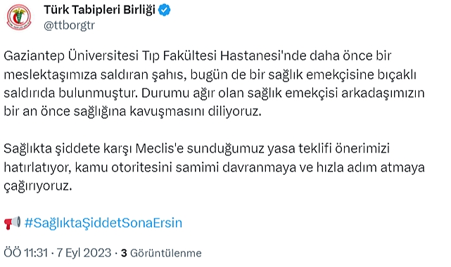 Türk Tabipleri Birliği (TTB), Gaziantep Üniversitesi Tıp Fakültesi Hastanesi’nde görev yapan bir sağlık çalışanına yapılan bıçaklı saldırıya ilişkin; “Gaziantep Üniversitesi Tıp Fakültesi Hastanesi’nde daha önce bir meslektaşımıza saldıran şahıs, bugün de bir sağlık emekçisine bıçaklı saldırıda bulunmuştur. Durumu ağır olan sağlık emekçisi arkadaşımızın bir an önce sağlığına kavuşmasını diliyoruz. Sağlıkta şiddete karşı Meclis'e sunduğumuz yasa teklifi önerimizi hatırlatıyor, kamu otoritesini samimi davranmaya ve hızla adım atmaya çağırıyoruz” açıklamasını yaptı.Gaziantep Üniversitesi Tıp Fakültesi Hastanesi'nde görevli bir sağlık çalışanı bıçaklı saldırıya uğradı. Sağlık çalışanın durumunun ağır olduğu öğrenildi. Olaya ilişkin açıklama yapan Türk Tabipleri Birliği, hükümete sağlıkta şiddete karşı sundukları teklifin bir an önce yasalaştırılması çağrısı yaptı. TTB’nin açıklaması şöyle:“Gaziantep Üniversitesi Tıp Fakültesi Hastanesi’nde daha önce bir meslektaşımıza saldıran şahıs, bugün de bir sağlık emekçisine bıçaklı saldırıda bulunmuştur. Durumu ağır olan sağlık emekçisi arkadaşımızın bir an önce sağlığına kavuşmasını diliyoruz. Sağlıkta şiddete karşı Meclis'e sunduğumuz yasa teklifi önerimizi hatırlatıyor, kamu otoritesini samimi davranmaya ve hızla adım atmaya çağırıyoruz.”
