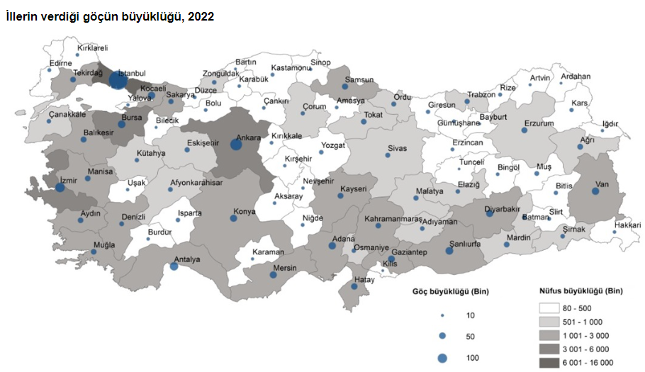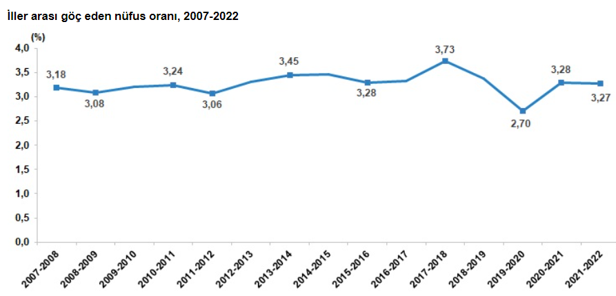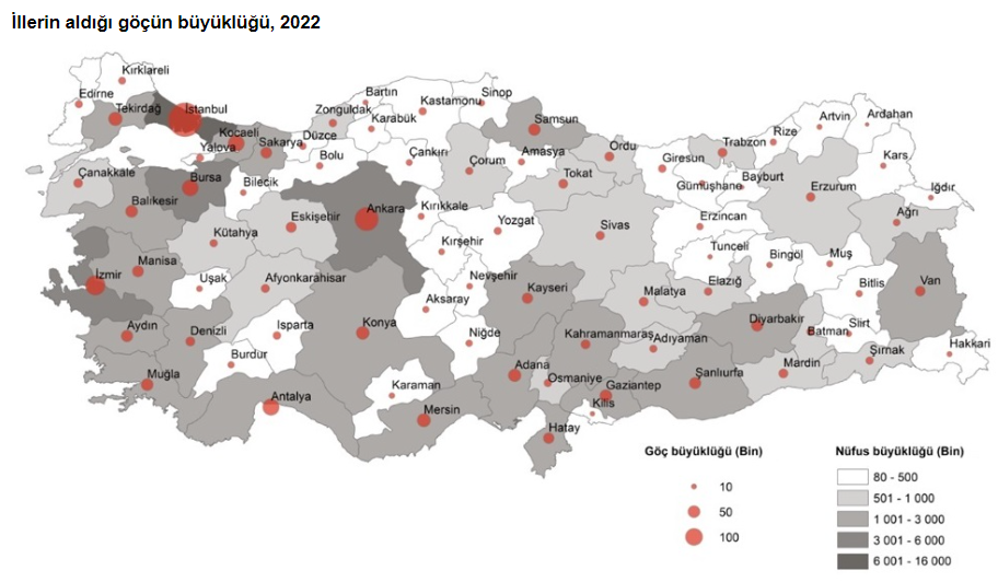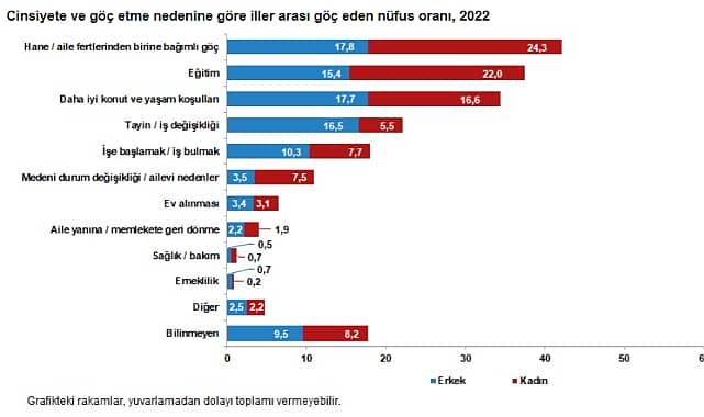 Türkiye İstatistik Kurumu (TÜİK) verilerine göre, 2022 yılında Türkiye’de 2 milyon 791 bin 156 kişi iller arasında göç etti. İller arası göç eden nüfus oranı da yüzde 3,27 oldu. En çok göç alan ve veren il İstanbul iken en az göç alan il Ardahan, en az göç veren il ise Tunceli oldu.TÜİK, 2022 yılına ilişkin iç göç istatistiklerini bugün açıkladı. Buna göre, 2002’de Türkiye’de 2 milyon 791 bin 156 kişi iller arasında göç etti. 2007-2008 döneminde yüzde 3,18 olan iller arası göç eden nüfus oranı, yıllar içinde inişli ve çıkışlı bir seyir izleyerek geçen yıl yüzde 3,27 oldu. Göç eden nüfusun yüzde 47,9’unu erkekler, yüzde 52,1’ini ise kadınlar oluşturdu.EN ÇOK GÖÇ ALAN İL İSTANBUL, EN AZ GÖÇ ALAN İL ARDAHAN OLDUTürkiye’de iller arası göç eden nüfusun dağılımına bakıldığında İstanbul, 385 bin 294 kişi ile en çok göç alan il oldu. İstanbul’u sırasıyla 189 bin 104 kişi ile Ankara ve 132 bin 426 kişi ile İzmir takip etti. En az göç alan iller ise sırasıyla 5 bin 391 kişi ile Ardahan, 7 bin 31 kişi ile Bayburt ve 8 bin 8 kişi ile Kilis olarak gerçekleşti.EN ÇOK GÖÇ VEREN İL İSTANBUL, EN AZ GÖÇ VEREN İL TUNCELİ OLDUEn çok göç alan iller olan İstanbul, Ankara ile İzmir’in aynı zamanda en çok göç veren iller olduğu görüldü. 418 bin 82 kişi ile İstanbul en çok göç veren il olurken onu 161 bin 912 kişi ile Ankara ve 107 bin 312 kişi ile İzmir takip etti. En az göç veren iller ise sırasıyla 7 bin 578 kişi ile Tunceli, 7 bin 629 kişi ile Kilis ve 8 bin 157 kişi ile Ardahan oldu.EN ÇOK 20-24 YAŞ GRUBUNDAKİ NÜFUS GÖÇ ETTİBüyüklük olarak en fazla göç hareketliliği, 643 bin 998 kişi ile 20-24 yaş grubunda gerçekleşti. Söz konusu yaş grubunda göç edenlerin yüzde 42,5’ini erkekler, yüzde 57,5’ini ise kadınlar oluşturdu. İller arası göç eden 2 milyon 791 bin 156 kişiden 591 bin 790’ı hanedeki fertlerden birine bağımlı göç etti. Diğer göç etme nedenleri incelendiğinde 526 bin 8 kişinin eğitim, 479 bin 250 kişinin ise daha iyi konut ve yaşam koşulları nedeniyle göç ettiği görüldü.ERKEKLERDE VE KADINLARDA EN ÖNEMLİ GÖÇ NEDENİ HANEDEKİ FERTLERDEN BİRİNE BAĞIMLI GÖÇ OLDUCinsiyete göre göç etme nedeni incelendiğinde hem erkeklerde hem de kadınlarda en çok hanedeki fertlerden birine bağımlı olarak göç hareketliliğinin yaşandığı görüldü. Erkeklerde 237 bin 574 kişi, kadınlarda da 354 bin 216 kişi hanedeki fertlerden birine bağımlı göç etti.20-24 YAŞ GRUBUNDA EN ÖNEMLİ GÖÇ NEDENİ EĞİTİM OLDUEn fazla göç hareketliliğinin yaşandığı yaş grubu olan 20-24 yaş grubunun göç etme nedeni incelendiğinde bu hareketliliğin en önemli nedeninin eğitim olduğu görüldü. Söz konusu yaş grubunda göç edenlerin 257 bin 676’sı eğitim, 91 bin 612’si işe başlamak veya iş bulmak ve 50 bin 338’i daha iyi konut ve yaşam koşulları nedeniyle göç etti.