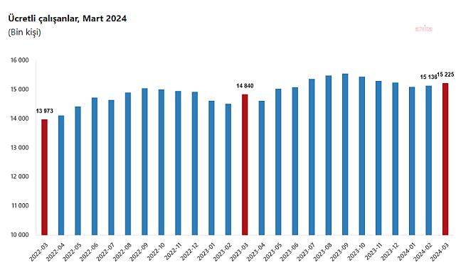 (ANKARA) - Türkiye İstatistik Kurumu (TÜİK), "Ücretli Çalışan İstatistikleri Mart -2024" bültenine göre, ücretli çalışan sayısı yıllık yüzde 2,6 artarken, aylık ise yüzde 0,1 azaldı.TÜİK, "Ücretli Çalışan İstatistikleri Mart -2024" bültenini yayınladı. Buna göre sanayi, inşaat ve ticaret-hizmet sektörleri toplamında ücretli çalışan sayısı 2024 Mart ayında bir önceki yılın aynı ayına göre yüzde 2,6 arttı. Ücretli çalışan sayısı bir önceki yılın aynı ayında 14 milyon 839 bin 534 kişi iken, 2024 yılı Mart ayında 15 milyon 225 bin 128 kişi oldu.SANAYİ SEKTÖRÜNDE AZALMA, İNŞAAT SEKTÖRÜNDE ARTIŞÜcretli çalışanların alt detaylarına bakıldığında ise 2024 Mart ayında ücretli çalışan sayısı yıllık olarak sanayi sektöründe yüzde 1,0 azaldı, inşaat sektöründe yüzde 9,3 arttı ve ticaret-hizmet sektöründe yüzde 3,5 arttı. Sanayi, inşaat ve ticaret-hizmet sektörleri toplamında ücretli çalışan sayısı 2024 Mart ayında bir önceki aya göre yüzde 0,1 azaldı.Ücretli çalışanların alt detaylarına bakıldığında; 2024 Mart ayında ücretli çalışanlar aylık olarak sanayi sektöründe yüzde 0,4 azaldı, inşaat sektöründe yüzde 0,1 azaldı ve ticaret-hizmet sektöründe yüzde 0,1 arttı.