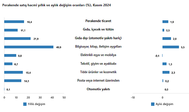 (ANKARA) - TÜİK’in, 2024 yılı Kasım ayına ait ticaret satış hacim endeksi verilerine göre, ticaret satış hacmi yıllık yüzde 8,7, perakende satış hacmi de yıllık yüzde 16,4 artış gösterdi.Türkiye İstatistik Kurumu (TÜİK), 2024 yılı Kasım ayına ait ticaret satış hacim endeksini açıkladı.Buna göre, ticaret satış hacmi, 2024 yılı Kasım ayında, bir önceki yılın aynı ayına göre yüzde 8,7 arttı. Aynı dönemde, motorlu kara taşıtlarının ve motosikletlerin toptan ve perakende ticareti ile onarımı için satış hacmi yüzde 10,2, toptan ticaret satış hacmi ise yüzde 5,3, perakende ticaret satış hacmi ise yüzde 16,4 artış gösterdi.Ticaret satış hacmi, 2024 yılı Kasım ayında, bir önceki aya göre de yüzde 0,9 artış kaydetti. Bu dönemde, motorlu kara taşıtlarının ve motosikletlerin toptan ve perakende ticareti ile onarımı için satış hacmi yüzde 0,2, toptan ticaret satış hacmi yüzde 0,6, perakende ticaret satış hacmi ise yüzde 1,9 arttı.
