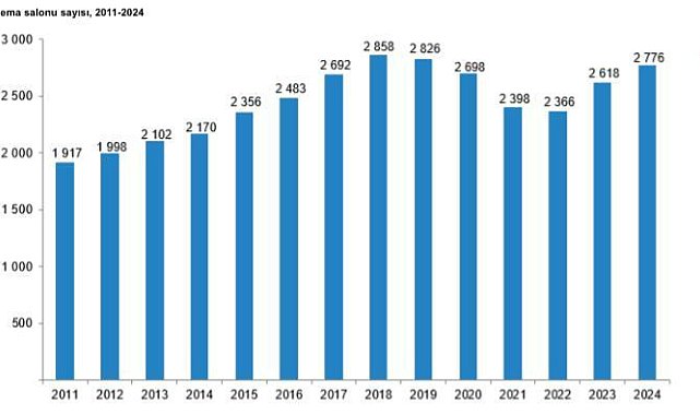 Sinema Genel Müdürlüğü verilerine göre, 2024 yılında 295'i yerli 441'i yabancı film olmak üzere toplam 736 film vizyona girmiştir. 2024 yılında sinema salonu sayısı 2 bin 776 olurken, sinema salonlarındaki koltuk sayısı 317 bin 274 oldu.