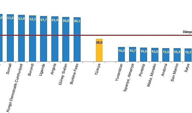 (ANKARA) - TÜİK’in Dünya Nüfus Günü bültenine göre; Türkiye’de yüzde 26 olan çocuk nüfus oranı, yüzde 29.8 olan dünya ortalamasının altında. Doğurganlık hızında dünya ortalaması, 2023 yılında 2,31 çocuk olurken, Türkiye'nin toplam doğurganlık hızının ise 1,51 çocuk ile dünya ortalamasının ve 27 AB ülke ortalamasının da altında kaldığı görüldü.Türkiye İstatistik Kurumu (TÜİK), 2024 Dünya Nüfus Günü bültenini yayınladı. Rapora göre Türkiye, nüfus büyüklüğüne göre sıralamada 194 ülke arasında 18. sırada yer aldı.Çocuk nüfus oranının en yüksek olduğu ülkeler Nijer ve Orta Afrika Cumhuriyeti Birleşmiş Milletler dünya nüfus tahminlerine göre, ülkelerin toplam nüfusları içindeki 0-17 yaş grubu çocuk nüfus oranları incelendiğinde, 2023 yılında en yüksek çocuk nüfus oranına sahip olan ülkeler, yüzde 55,5 ile Nijer ve Orta Afrika Cumhuriyeti oldu. Bu ülkeleri yüzde 54,2 ile Çad ve yüzde 54,0 ile Mali izledi. Çocuk nüfus oranının en düşük olduğu ülke, yüzde 13,9 ile Kore Cumhuriyeti oldu. Bu ülkeyi yüzde 14,1 ile Japonya, yüzde 14,2 ile Singapur izledi.Çocuk nüfus oranı dünya ortalaması, 2023 yılında yüzde 29,8 oldu. Türkiye'deki çocuk nüfus oranının yüzde 26,0 ile dünya çocuk nüfus ortalamasının altında kaldığı görüldü. Türkiye'nin çocuk nüfus oranının Avrupa Birliği üye ülkelerinden yüksek olduğu görüldüBirleşmiş Milletler dünya nüfus tahminlerine göre, Avrupa Birliği (AB) üyesi 27 ülkenin çocuk nüfus oranları incelendiğinde, 2023 yılında en yüksek çocuk nüfus oranına sahip olan ülkelerin sırasıyla yüzde 23,3 ile İrlanda, yüzde 21,0 ile İsveç ve yüzde 20,7 ile Fransa olduğu görüldü. Çocuk nüfus oranının en düşük olduğu ülkeler ise sırasıyla yüzde 15,1 ile İtalya, yüzde 15,6 ile Malta ve yüzde 16,0 ile Portekiz oldu.Türkiye'nin çocuk nüfus oranının yüzde 26,0 ile AB üye ülkelerinin çocuk nüfus oranlarından daha yüksek olduğu görüldü. Genç nüfus oranının en yüksek olduğu ülke Suriye oldu Birleşmiş Milletler dünya nüfus tahminlerine göre, ülkelerin toplam nüfusları içindeki 15-24 yaş grubu genç nüfus oranları incelendiğinde, 2023 yılında en yüksek genç nüfus oranına sahip olan ülke, yüzde 24,1 ile Suriye oldu. Bu ülkeyi yüzde 22,3 ile Orta Afrika Cumhuriyeti ve Doğu Timor, yüzde 22,1 ile Eritre izledi. Genç nüfus oranının en düşük olduğu ülke, yüzde 6,8 ile Ukrayna oldu. Bu ülkeyi yüzde 7,6 ile Katar, yüzde 8,5 ile Monako izledi. Genç nüfus oranı dünya ortalaması, 2023 yılında yüzde 15,5 oldu. Türkiye'nin genç nüfus oranın yüzde 15,1 ile dünya genç nüfus ortalamasının hemen altında olduğu görüldü. Türkiye'nin genç nüfus oranının Avrupa Birliği üye ülkelerinden yüksek Birleşmiş Milletler dünya nüfus tahminlerine göre, AB üyesi 27 ülkenin genç nüfus oranları incelendiğinde, 2023 yılında en yüksek genç nüfus oranına sahip olan ülkelerin sırasıyla yüzde 13,1 ile İrlanda, yüzde 12,0 ile Danimarka, yüzde 11,9 ile Hollanda. En düşük genç nüfus oranına sahip olan ülkeler sıralamasında yüzde 9,0 ile Malta, yüzde 9,4 ile Litvanya, yüzde 9,5 ile Bulgaristan ve Slovenya geliyor. Türkiye'nin genç nüfus oranının yüzde 15,1 ile AB üyesi 27 ülkenin genç nüfus oranlarından daha yüksek olduğu görüldü. Yaşlı nüfus oranının en yüksek olduğu ülke Monako olduÜlkelerin toplam nüfusları içindeki 65 ve daha yukarı yaştaki yaşlı nüfus oranları incelendiğinde, 2023 yılında en yüksek yaşlı nüfus oranına sahip olan ülke, yüzde 35,8 ile Monako oldu. Bu ülkeyi yüzde 30,1 ile Japonya, yüzde 24,5 ile İtalya izledi. Yaşlı nüfus oranının en düşük olduğu ülke, yüzde 1,6 ile Katar oldu. Bu ülkeyi yüzde 1,7 ile Uganda, yüzde 1,8 ile Zambiya izledi. Yaşlı nüfus oranı dünya ortalaması, 2023 yılında yüzde 10 oldu. Türkiye'nin yaşlı nüfus oranının yüzde 10,2 ile dünya yaşlı nüfus ortalamasının hemen üzerinde olduğu görüldü. Türkiye'nin yaşlı nüfus oranının Avrupa Birliği üye ülkelerinden düşük olduğu görüldü AB üyesi 27 ülkenin yaşlı nüfus oranları incelendiğinde, 2023 yılında en yüksek yaşlı nüfus oranına sahip olan ülkelerin sırasıyla yüzde 24,5 ile İtalya, yüzde 23,6 ile Finlandiya ve yüzde 23,3 ile Portekiz olduğu görüldü. En düşük yaşlı nüfus oranına sahip olan ülkelerin ise sırasıyla yüzde 15,2 ile Güney Kıbrıs Rum Yönetimi, yüzde 15,4 ile Lüksemburg, yüzde 15,5 ile İrlanda olduğu görüldü. Türkiye'nin yaşlı nüfus oranının yüzde 10,2 ile AB üyesi 27 ülkenin yaşlı nüfus oranlarından daha düşük olduğu görüldü. Toplam doğurganlık hızının en yüksek olduğu ülke 6,67 çocuk ile Nijer olduBirleşmiş Milletler dünya nüfus tahminlerine göre, ülkelerin toplam doğurganlık hızları incelendiğinde, 2023 yılında en yüksek toplam doğurganlık hızına sahip olan ülke, 6,67 çocuk ile Nijer oldu. Bu ülkeyi 6,12 çocuk ile Çad ve 6,10 çocuk ile Somali izledi. Toplam doğurganlık hızının en düşük olduğu ülke, 0,88 çocuk ile Kore Cumhuriyeti oldu. Bu ülkeyi 1,04 çocuk ile Singapur ve 1,15 çocuk ile Andorra ve San Marino izledi. Toplam doğurganlık hızı dünya ortalaması, 2023 yılında 2,31 çocuk oldu. Türkiye'nin toplam doğurganlık hızının 1,51 çocuk ile dünya ortalamasının altında kaldığı görüldü. Toplam doğurganlık hızının en yüksek olduğu AB ülkesi 1,79 çocuk ile Fransa olduAB üyesi 27 ülkenin toplam doğurganlık hızları incelendiğinde, 2023 yılında en yüksek toplam doğurganlık hızına sahip olan ülke, 1,79 çocuk ile Fransa oldu. Bu ülkeyi 1,76 çocuk ile İrlanda ve 1,74 çocuk ile Romanya izledi. Toplam doğurganlık hızının en düşük olduğu ülke, 1,22 çocuk