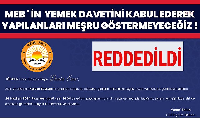 “Milli Eğitim Bakanı Yusuf Tekin tüm sendika başkanlarını 24 Haziran 2024 tarihinde Ankara'da yapılacak yemeğe davet etmiştir. Eğitimde yaşanan problemleri çözmek yerine ideolojik hedefler doğrultusunda eğitimi şekillendirmeye çalışan, eğitimi sermayeye, cemaat ve tarikatlara teslim eden söz konusu Milli Eğitim Bakanı'dır. Eğitimde yaşanan sorunların, okullarda ve müfredatta yaşanan gerici yaklaşımların, anti laik uygulamaların, uluslararası alanda itibarsızlaştırılan eğitim sisteminin temel nedeni Milli Eğitim Bakanı Yusuf Tekin'in ısrarcı politikalarıdır. Aynı bakan cemaat ve tarikatların etkisiyle eğitimde din referanslı bir süreci dayatmış, ÇEDES projesi gibi karanlık ve gerici bir projeyi dayatmaya devam etmektedir.