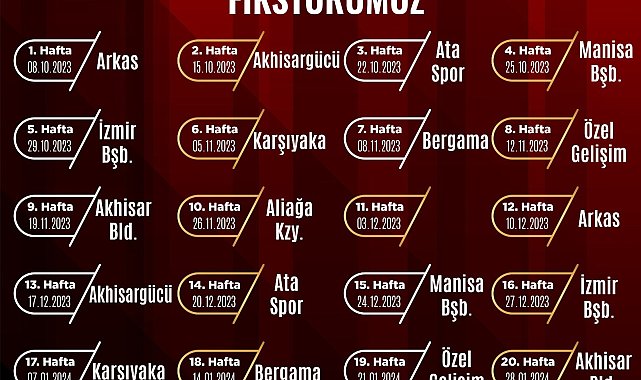 Turgutlu Belediyesi Kadın Voleybol Takımı’nın fikstürü belli oldu. Kadın voleybol takımı buna göre ilk maçını 8 Ekim Pazar günü Arkas, son maçını ise 31 Ocak Çarşamba günü Aliağa KZY ile oynayacak.