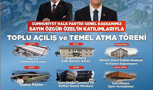 Turgutlu Belediyesinin 226 milyon TL’lik yatırımla kente kazandırdığı Turgutlu Belediyesi 100.Yıl Cumhuriyet Çarşısı, Cuma Pazarı, Selvilitepe Cemevi ve Kültür Sanat Merkezi, Çepnibektaş Çok Amaçlı Salon, Ekrem Gürel Kültür Merkezi ve Kadın Sığınmaevi ile Selvilitepe Spor Kompleksi için toplu açılış ve temel atma töreni düzenlenecek. Törene CHP Genel Başkanı Özgür Özel de katılacak.