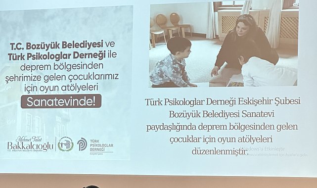 Kahramanmaraş merkezli 6 Şubat depremlerinin birinci yılında Türk Psikologlar Derneği Eskişehir Şubesi tarafından Bozüyük Belediyesi Sanatevi’ne teşekkür belgesi takdim edildi. Bozüyük Belediyesi 6 Şubat’ın ardından deprem bölgesine destek olmuş, ilçeye gelen depremzedelere de gerekli her türlü desteği sağlamıştı. Bu kapsamda geçen yıl mart ve nisan aylarında Bozüyük Belediyesi Sanatevi ile Eskişehir Türk Psikologlar Derneği paydaşlığında deprem bölgesinden Bozüyük’e gelen çocuklar için Sanatevi’inde oyun atölyeleri düzenlendi. Söz konusu çalışmanın ardından depremlerin birinci yılında düzenlenen toplantıda Türk Psikologlar Derneği Eskişehir Şubesi tarafından Bozüyük Belediyesi Sanatevi’ne teşekkür belgesi verildi. Belge, Bozüyük Belediye Tiyatrosu Genel Sanat Yönetmen Yardımcısı İlknur Durmaz’a takdim edildi.