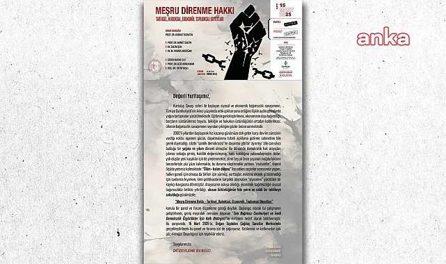 (ANKARA) - Türkiye İnsan Hakları Kurumu Vakfı (TİHAK), "Meşru Direnme Hakkı: Tarihsel, Hukuksal, Ekonomik, Toplumsal Boyutları" isimli panel ve forum düzenleyecek.TİHAK tarafından 15 Mart’ta saat 12.00’de gerçekleştirilecek etkinlik, Çankaya Belediyesi Doğan Taşdelen Çağdaş Sanatlar Merkezi’nde yapılacak.Prof. Dr. Korkut Boratav’ın onur konuğu olarak yer alacağı etkinlikte Prof. Dr. Ahmet Saltık, Avukat Salim Şen, Avukat M. Aybars Akdoğan, gazeteci Ceren Bayar, Prof. Dr. Aziz Konukman ile Doç. Dr. Fatih Yaşlı bulunacak. Oturum yöneticiliğini Dr. Öğretim Üyesi Abbas Kılıç üstlenecek. Kurumun panele ilişkin duyurusunda "Anayasanın askıya alındığı, ekonomik bağımsızlığın siyasal bağımsızlıkla birlikte yitirildiği, ulusun bütünlüğünün bile yakın ve ciddi tehlikeye sokulduğu günümüzde; ‘Meşru Direnme Hakkı - Tarihsel, Hukuksal, Ekonomik, Toplumsal Boyutları’ konulu bir panel ve forum düzenleme gereği duyduk" denildi.
