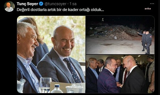 (ANKARA)-Tutuklu olan eski İzmir Büyükşehir Belediye Başkanı Tunç Soyer, tutuklanan CHP'li belediye başkanları, Zeydan Karalar, Muhittin Böcek ve ev hapsine alınan Abdurrahman Tutdere ile olan fotoğrafları paylaşarak, "Değerli dostlarla artık bir de kader ortağı olduk" dedi.4 Temmuz’da tutklanan eski İzmir Büyükşehir Belediye Başkanı Tunç Soyer, CHP’li belediyelere yönelikoperasyonlarda tutuklanan Adana Büyükşehir Belediye Başkanı Zeydan karalar, Antalya Büyükşehir Belediye Başkanı Muhittin Böcek ve ev hapsi kararıyla serbest bırakılan Adıyaman Belediye Başkanı Abdurrahman Tutdere ile olan fotoğraflarını paylaştı.Soyer’in sosyal medya hesabından yapılan paylaşımda şu ifadelere yer verildi: "Değerli dostlarla artık bir de kader ortağı olduk."