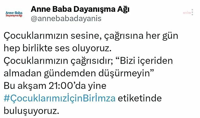 CHP'nin Cumhurbaşkanı adayı, İstanbul Büyükşehir Belediye Başkanı Ekrem İmamoğlu’nun tutuklanmasının ardından yapılan protestolarda tutuklanan veya ev hapsi cezası verilen üniversite öğrencilerinin aileleri, dayanışma ağı kurdu. "Anne Baba Dayanışma Ağı" adı altında biraraya gelen ve çocuklarının serbest bırakılmasını isteyen aileler, "Çocuklarımız İçin Bir İmza" başlığıyla imza kampanyası da başlattı.Aileler, her gün saat 21.00’de, sosyal medya üzerinden "Çocuklarımız İçin Bir İmza" etiketinde buluşma çağrısı yaptı."Bizi içeriden almadan gündemden düşürmeyin""Anne Baba Dayanışma Ağı" adıyla sosyal medya üzerinde açılan hesaplardan yapılan paylaşımda, şu açıklamalara yer verildi:"Çocuklarımızın sesine, çağrısına her gün hep birlikte ses oluyoruz. Çocuklarımızın çağrısıdır; ‘Bizi içeriden almadan gündemden düşürmeyin’ Bu Akşam 21.00’de yine ‘Çocuklarımız İçin Bir İmza’ etiketinde buluşuyoruz."Ailelerin "change.org" üzerinden başlattıkları imza kampanyasına şu ana kadar 30 binin üzerinde kişi imza attı.Reklam