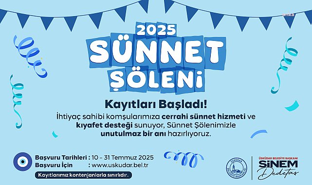 (İSTANBUL) – Üsküdar Belediyesi, sosyal belediyecilik kapsamında ihtiyaç sahibi ailelerin çocuklarına yönelik ücretsiz sağlık hizmetlerini sürdürüyor. Belediye, 2025 yılı yaz döneminde düzenleyeceği Sünnet Şöleni için kayıt almaya başladı.Üsküdar Belediyesi’nin sosyal destek programları kapsamında düzenlediği 2025 Sünnet Şöleni için başvurular başladı. Başvurular 10-31 Temmuz tarihleri arasında kabul edilecek. İlçede ikamet eden ve 4-12 yaş aralığında bulunan erkek çocuklara yönelik yürütülen program kapsamında, çocuklar Sağlık Bakanlığı onaylı uzman doktorlar tarafından hijyenik koşullarda ücretsiz olarak sünnet edilecek. Belediye ayrıca sünnet kıyafetlerini de ücretsiz olarak temin edecek.“Şenlik düzenlenecek, çocuklara unutulmaz bir gün yaşatılacak”Cerrahi işlemlerin ardından çocuklar ve aileleri için ikramların ve çeşitli etkinliklerin yer alacağı bir şenlik programı düzenlenecek. Belediyeden yapılan açıklamada, bu özel günle çocuklara unutulmaz anılar kazandırmanın ve ihtiyaç sahibi ailelerin çocuklarının güvenli sağlık hizmetine erişimini sağlamanın hedeflendiği belirtildi.“Başvurular internet üzerinden yapılacak”Kontenjanın sınırlı olduğu belirtilen hizmet için kayıtlar, 10 Temmuz – 31 Temmuz tarihleri arasında Üsküdar Belediyesi’nin resmi internet sitesi olan www.uskudar.bel.tr adresi üzerinden yapılabilecek.