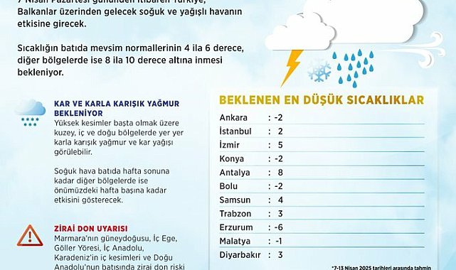 (ANKARA) - Çevre, Şehircilik ve İklim Değişikliği Bakanlığı, yarından itibaren hava sıcaklıklarının mevsim normallerinin altına düşeceğini duyurdu.Bakanlığın sosyal medya hesabından yapılan açıklamada, ani sıcaklık düşüşü nedeniyle vatandaşlara uyarıda bulunularak, şunlar kaydedildi:"Meteoroloji Genel Müdürlüğümüzden alınan verilere göre, yarından itibaren ülkemizde hava sıcaklıklarında düşüş bekleniyor. Soğuk havanın etkisiyle sıcaklıklar batı kesimlerde mevsim normallerinin 4-6 derece, diğer bölgelerde ise 8-10 derece altına inecek. Ani sıcaklık düşüşü nedeniyle tarımsal faaliyetlerin devam ettiği Marmara’nın güneydoğusu, İç Ege, Göller Yöresi, İç Anadolu, Karadeniz’in iç kesimleri ve Doğu Anadolu’nun batısında, zirai don riskine karşı vatandaşlarımızın daha dikkatli ve tedbirli olmaları gerekmektedir."