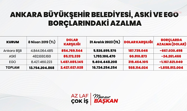 Ankara Büyükşehir Belediyesi şeffaf yönetim ve hesap verme anlayışı gereğince Seçim Öncesi Mali Raporu’nu internet sitesi üzerinden yayınlamaya başladı. Tüm vatandaşların erişimine açık olan rapora göre, borçlarda 5 yılda 1 milyar 858 bin 913 dolar azalma oldu.Ankara Büyükşehir Belediyesi, Başkent'te şeffaf yönetim anlayışı doğrultusunda şimdi de Seçim Öncesi Mali Raporu’nu vatandaşların erişimine açtı.Ankara Büyükşehir Belediye Başkanı Mansur Yavaş’ın göreve geldiği 8 Nisan 2019 tarihi ile 31 Aralık 2023 tarihi arasındaki gelişmeleri gösteren mali tabloların açıklandığı rapora göre, borçlarda 5 yılda 1 milyar 858 bin 913 dolar azalma oldu.YAVAŞ AÇIKLADI: “TÜRKİYE’DE BİR İLK”Temiz ve şeffaf siyaset amacıyla daha önce mal varlığını kamuoyuna açıklayan Ankara Büyükşehir Belediye Başkanı Mansur Yavaş, sosyal medya hesaplarından yaptığı paylaşımla 5 yıllık görev dönemindeki mali faaliyetlerdeki gelişmeleri içeren Seçim Öncesi Mali Raporu’nu açıkladıklarını duyurdu. Yavaş, şu ifadeleri kullandı:“Temiz, şeffaf siyaset için mal varlığımı kamuoyuna açıklamıştım. Türkiye’de bir ilk… Şimdi de seçimden sonra Belediyeyi nasıl devir aldığımızı ve seçime giderken nereye getirdiğimizi gösteren Belediyemizin 2019-2024 yılları arası 5 yıllık mali işlemlerimizdeki gelişmeleri gösteren Seçim Öncesi Mali Raporu’muzu açıklıyoruz. Halktan aldığımız paranın hesabını kuruşu kuruşuna halka vermeye devam edeceğiz. Rapora ulaşmak için: https://www.ankara.bel.tr/dokumanlar/saydamlik-ve hesapverilebilirlik/secim-oncesi-mali-raporlar”TÜM VATANDAŞLARIN ERİŞİMİNE AÇIKMansur Yavaş dönemi Ankara Büyükşehir Belediyesi'nin mali tablolarını görmek isteyen tüm vatandaşlar, rapora erişebiliyor. 5 yıllık Seçim Öncesi Mali Raporu’na https://www.ankara.bel.tr/dokumanlar/saydamlik-ve hesapverilebilirlik/secim-oncesi-mali-raporlar adresinden ulaşılabiliyor.