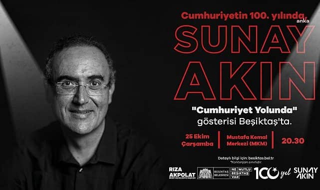 Yazar ve şair Sunay Akın, Cumhuriyet'in 100. yılına özel Beşiktaş’ta sevenleriyle buluşacak. Usta sanatçı ‘Cumhuriyet Yolunda’ isimli gösterisiyle Beşiktaşlı vatandaşlara tarihin bilinmeyen yönlerini kendine has üslubuyla anlatacak.Beşiktaş Belediyesi, Cumhuriyet'in 100. yılına özel olarak hazırlanan etkinliklere, 25 Ekim’de yazar ve şair Sunay Akın’ın Mustafa Kemal Kültür Merkezi'nde (MKM) gerçekleşecek ‘Cumhuriyet Yolunda’ gösterisiyle başlayacak.Usta sanatçı Cumhuriyet'in kuruluşundan önce yaşanan tarihi anları ve bağımsızlığa ışık tutan bilgileri izleyiciyle paylaşacak.