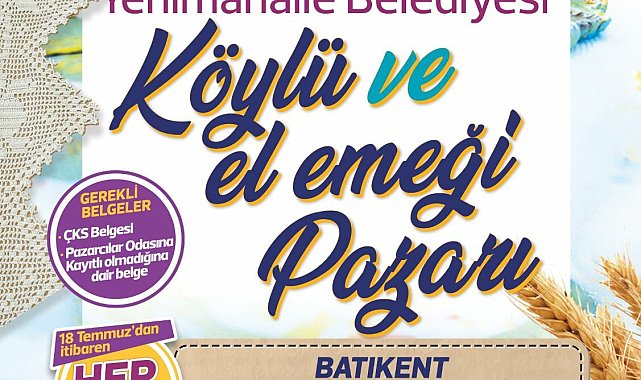 Yenimahalle Belediyesi Köylü ve El Emeği Pazarı 18 Temmuz'dan itibaren her salı Batıkent Batı Sitesi Semt Pazarı’nda ve 20 Temmuz'dan itibaren ise her perşembe günü, Yenimahalle Kapalı Semt Pazarı’nda organik sebze ve meyveler ile el emeği ürünleri vatandaşlarla buluşturacak.