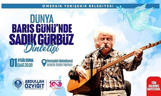 Mersin Yenişehir Belediyesi’nin ‘1 Eylül Dünya Barış Günü’ dolayısıyla düzenleyeceği programda Türk Halk Müziği’nin sevilen ismi Sadık Gürbüz sahne alacak. Dünyada çatışmaların sona ermesi, insan haklarının korunması ve küresel dayanışmanın öneminin vurgulandığı 1 Eylül Dünya Barış Günü’nde Yenişehir Belediyesi, Sadık Gürbüz dinletisiyle Mersinlileri bir araya getirecek. 1 Eylül Cuma günü saat 20.00’de Yenişehir Belediyesi Atatürk Kültür Merkezi’nde düzenlenecek dinleti programında sahne alacak Gürbüz türkülerini barış için okuyacak.Mersinlileri, Dünya Barış Günü programına davet eden Yenişehir Belediye Başkanı Abdullah Özyiğit, Ulu Önder Gazi Mustafa Kemal Atatürk’ün “Yurtta Barış, Dünyada Barış” sözüne dikkat çekerek, şunları söyledi:“Kültür ve sanat etkinliklerinin insanları bir araya getirerek ortak bir paydada buluşturduğuna inanıyoruz. Bu özel günde de müziğin ve sanatın gücünü kullanarak barışın güzelliklerini birlikte kutlamak istiyoruz. Barışın ve dayanışmanın önemini bir kez daha hatırlatmak ve vurgulamak adına, 1 Eylül'de gerçekleştireceğimiz programımıza tüm Mersinli hemşehrilerimizi bekliyoruz. Ulu Önder Gazi Mustafa Kemal Atatürk'ün bize miras bıraktığı 'Yurtta Barış, Dünyada Barış' ilkesini yaşatmak için mücadelemiz sürecek. Hep birlikte barışın sesi olmaya devam edeceğiz.”