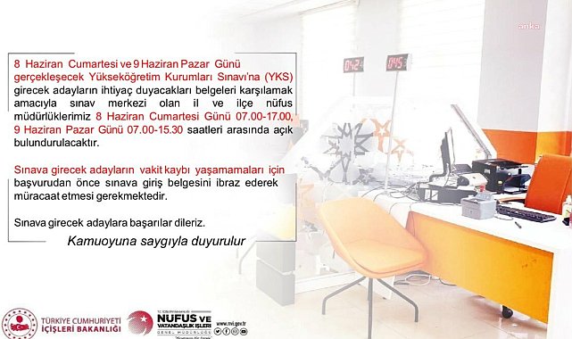 (ANKARA) - ÖSYM tarafından bu hafta sonu düzenlenecek Yükseköğretim Kurumları Sınavı'na katılacak adaylar için nüfus müdürlükleri saat 07.00'den itibaren açık olacak. Adayların nüfus cüzdanlarıyla ilgili işlemler randevusuz gerçekleştirilecek.Nüfus ve Vatandaşlık İşleri Genel Müdürlüğü'nden yapılan açıklamada, YKS dolayısıyla sınav merkezi olan il ve ilçelerde nüfus müdürlüklerinin 8 Haziran Cumartesi 07.00-17.00 ve 9 Haziran Pazar günü 07.00-15.30 saatlerinde açık tutulacağı belirtildi.Öğrencilerin vakit kaybı yaşamamaları için başvurudan önce sınava giriş belgesini ibraz ederek müracaat etmesi gerektiği vurgulanan açıklamada, "İşlemler randevusuz olarak gerçekleştirilecektir. Sınava girecek adaylara başarılar dileriz" denildi.YKS'ye girecek adayların, yanlarında sınava giriş belgeleri ile fotoğraflı nüfus cüzdanlarını mutlaka bulundurması gerekiyor.