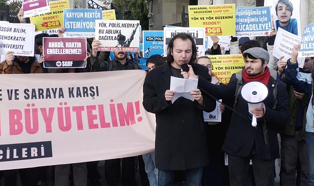 Haber: Beril KALELİ/Kamera: Onur DURSUN(İSTANBUL) - Beyazıt Meydanı'nda toplanan üniversite öğrencileri, kuruluşunun 43'üncü yılında YÖK'ü protesto etti. ''YÖK'ün adı gerilerde kaldı ama modeli, siyasi iktidarın belirlediği kayyumlar ile sürüyor. YÖK'ü kaldıracağız iddiasıyla iktidar olan AKP, 22 yıldır YÖK'ün tüm uygulamalarını üniversitelerde baskı ve faşist zihniyetin örgütlenmesine aracı olarak kullanıyor'' diyen öğrenciler can güvenliklerinin olmadığından yakındı. "Ölmeye değil, okumaya geldik" sloganları attı...Üniversite öğrencileri, kuruluşunun 43'üncü yılında Yükseköğretim Kurulu'nu (YÖK) protesto için Beyazıt Meydanı'nda İstanbul Üniversitesi önünde toplandı.''Yaşamlarımızı kazanmak için YÖK'e ve Saray'a karşı örgütlü mücadeleyi büyütelim'' yazılı pankart açan öğrenciler, ''Ölmeye değil, okumaya geldik'', ''Müşteri değil, öğrenciyiz'', ''Kayyumlar gidecek biz kalacağız'' sloganları attı.Üniversite hayatında yaşadıkları sıkıntıları dile getirerek YÖK'ü protesto eden öğrenciler, Esenyurt, Mardin, Batman ve Halfeti belediyelerine kayyum atanmasına da tepki gösterdi. Öğrencilerin yaptıkları açıklamalardan satır başları şu şekilde:''YÖK'ün kuruluşunun 43'üncü yılında bir araya geldik. Üniversitelerde devletin ve sermayenin denetimini artırmanın, demokratik kazanımları ortadan kaldırmanın ve gençlik mücadesini baskı altına almanın bir aracı olarak kurulan YÖK, 43 yıldır varlığını koruyor.''YÖK'ü kaldıracağız iddiasıyla iktidar olan AKP...''Darbe rejimi YÖK'ü üniversitelerdeki örgütlü mücadeleyi baltalamak ve ortadan kaldırmak için kurdu. Gelinen noktada YÖK'ün adı gerilerde kaldı ama modeli, siyasi iktidarın belirlediği kayyumlar ile sürüyor. YÖK'ü kaldıracağız iddiasıyla iktidar olan AKP, 22 yıldır YÖK'ün tüm uygulamalarını üniversitelerde baskı ve faşist zihniyetin örgütlenmesine aracı olarak kullanıyor.''Kayyum zihniyeti elbette bizim kampüslerimizle ilgilendiriyor''Üniversitelerde yaşadığımız durumlar genel ülke siyasetinden bağımsız değildir. Mardin'e, Batman'a, Halfeti'ye, Hakkari'ye, Esenyurt'a atanan kayyum zihniyeti elbette bizim kampüslerimizle ilgilendiriyor. Halkın iradesine atanan kayyumlar kampüslerimize de atanıyor. Son zamanlarda kayyum atanmayan devlet üniversitesi neredeyse kalmamış durumdadır.