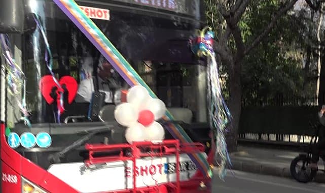 İzmir Büyükşehir Belediyesi ESHOT Genel Müdürlüğü bünyesinde şoför olarak görev yapan ve hayatlarını birleştirme kararı alan Yeliz Önemli ile Burak Bademli, unutulmaz bir nikah töreni yaşadı. Yeliz Önemli’nin yolcu taşıdığı otobüsü süsleyerek gelin arabasına dönüştüren çift, nikaha da bu araçla geldi. Çiftin nikahını İzmir Büyükşehir Belediye Başkanı Tunç Soyer kıydı.İzmir Büyükşehir Belediyesi ESHOT Genel Müdürlüğü bünyesinde şoför olarak görev yapan Yeliz Önemli (40) ile Burak Bademli (38), hayatlarını birleştirme kararı aldı. Bornova bölgesinde çalışan çift, nikahlarına da yolcu otobüsü ile geldi. Yeliz Önemli, yolcu taşırken kullandığı 249 numaralı otobüsü gelin aracına dönüştürüp, direksiyona da kendi geçti. Önce meslektaşı sonra da eşi olan Bademli’yi de yanına alan gelin, kendi nikahına gitmek için direksiyonu bu kez Bornova Nikah Dairesi’ne kırdı.NİKAHINI TUNÇ SOYER KIYDIİzmir Büyükşehir Belediye Başkanı Tunç Soyer ile ESHOT Genel Müdürü Erhan Bey de bu mutlu anlarında Yeliz Önemli ile Burak Bademli çiftini yalnız bırakmadı. Nikahı Başkan Soyer kıyarken, şahitler ise Erhan Bey, DİSK Genel İş İzmir 3 No’lu Şube Başkanı Serap Yılmaz, Kamil Propol ve Nursel Azalma oldu.Başkan Soyer, çifte mutluluklar dileyerek “Aile içi bir buluşma bu. Çok heyecanlıyım. Aile içi büyük bir mutluluk. Birbirine çok yakışan çiftimizin bu en güzel anlarına şahitlik etmek hepimiz için gurur verici. Diliyorum ki ömür boyu sevdiklerinizle huzur içerisinde, sonsuza dek sürecek mutluluğunuz olsun” dedi.Erhan Bey de nikah cüzdanını geline verirken “Her ne kadar Türk toplumunda aile reisi erkek gibi görünse de aslında kadınlarımız baş tacı. Ben defteri sevgili kızımıza veriyorum” dedi.“AŞKLA ESHOT, AŞKLA EVET" Yeliz Önemli de bu mutlu günlerinde kendilerine destek veren Başkan Tunç Soyer ile Erhan Bey’e teşekkür ederek, “Kendi kullandığım aracı gelin arabası yaparak kullanmak ayrı bir güzellik. Ayrıca bir onur. Yolcu taşıdığım otobüsü kendi nikahıma gelin arabası yaparak geldim. Aşkla ESHOT, aşkla evet, aşkla İzmir” diye konuştu.ESHOT’ta 6 yıldır çalışan Burak Bademli ise “Çok mutluyum. Her şey gönlümüzce olsun. Bu otobüsün artık hayatımızda farklı, çok daha önemli bir yeri var. Çalıştığım kurumu çok seviyorum” dedi.